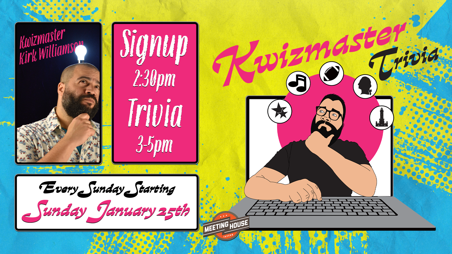 Put your knowledge to the test every Sunday from 2:30–5:00pm at Meeting House Tavern with our newest event, KWIZMASTER TRIVIA! Kwizmaster Kirk Williamson will be hosting every Sunday with questions that will challenge your team. Great questions, cold drinks, good vibes, and bragging rights up for grabs.